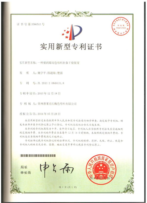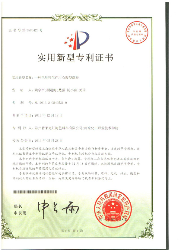 2014年5月28日,我司獲得了中華人民共和國知識產(chǎn)權(quán)局頒發(fā)的兩項(xiàng)實(shí)用新型專利,并已拿到證書,兩項(xiàng)專利分別是:—種聚丙烯用色母料拉條干燥裝置、—種色母料生產(chǎn)用心瓣型螺桿。